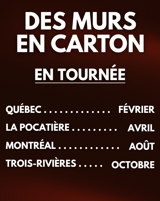 « Des murs en carton » prend aussi forme grâce à la contribution sensible et essentielle de Magali Babin, Mathieu Fecteau, Louis Rivest-Hénault et Hugo Nadeau, artistes collaborateur·trice·s et aides techniques du projet.